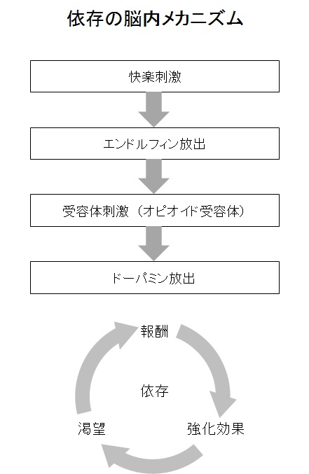 快楽刺激が来ると、エンドルフィンが放出され、受容体を刺激し、ドーパミンが放出されて、いい気分になって、それを繰り返すために、中毒になっていくそう。