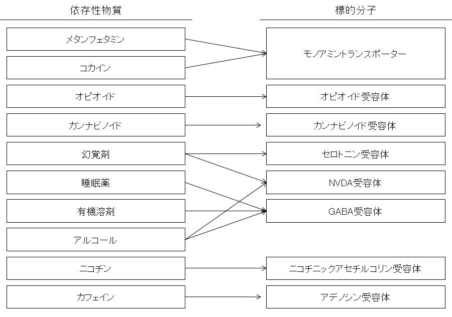 標的分子は、依存性物質によって異なります。