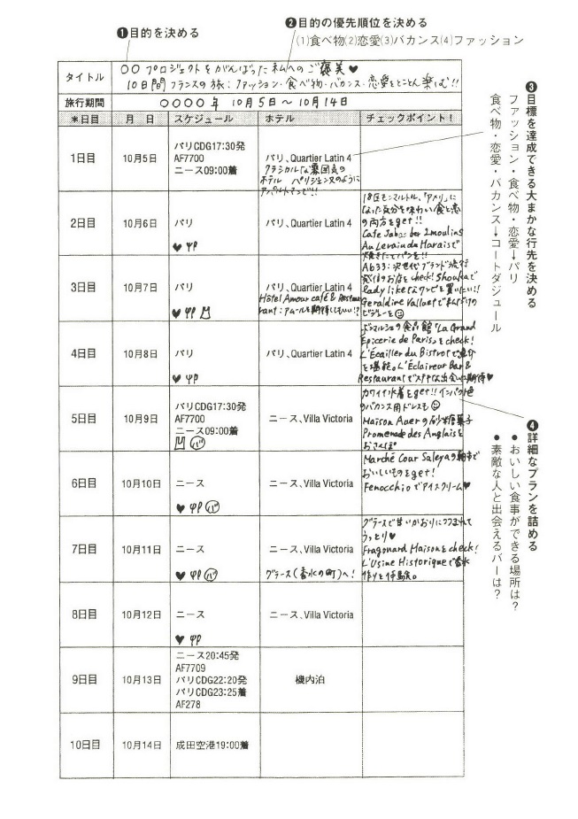 ①目的を決める、②目的の優先順位を決める、③目的を達成できる大まかな行先を決める、④詳細なプランを詰める(時間、詳細な場所)。