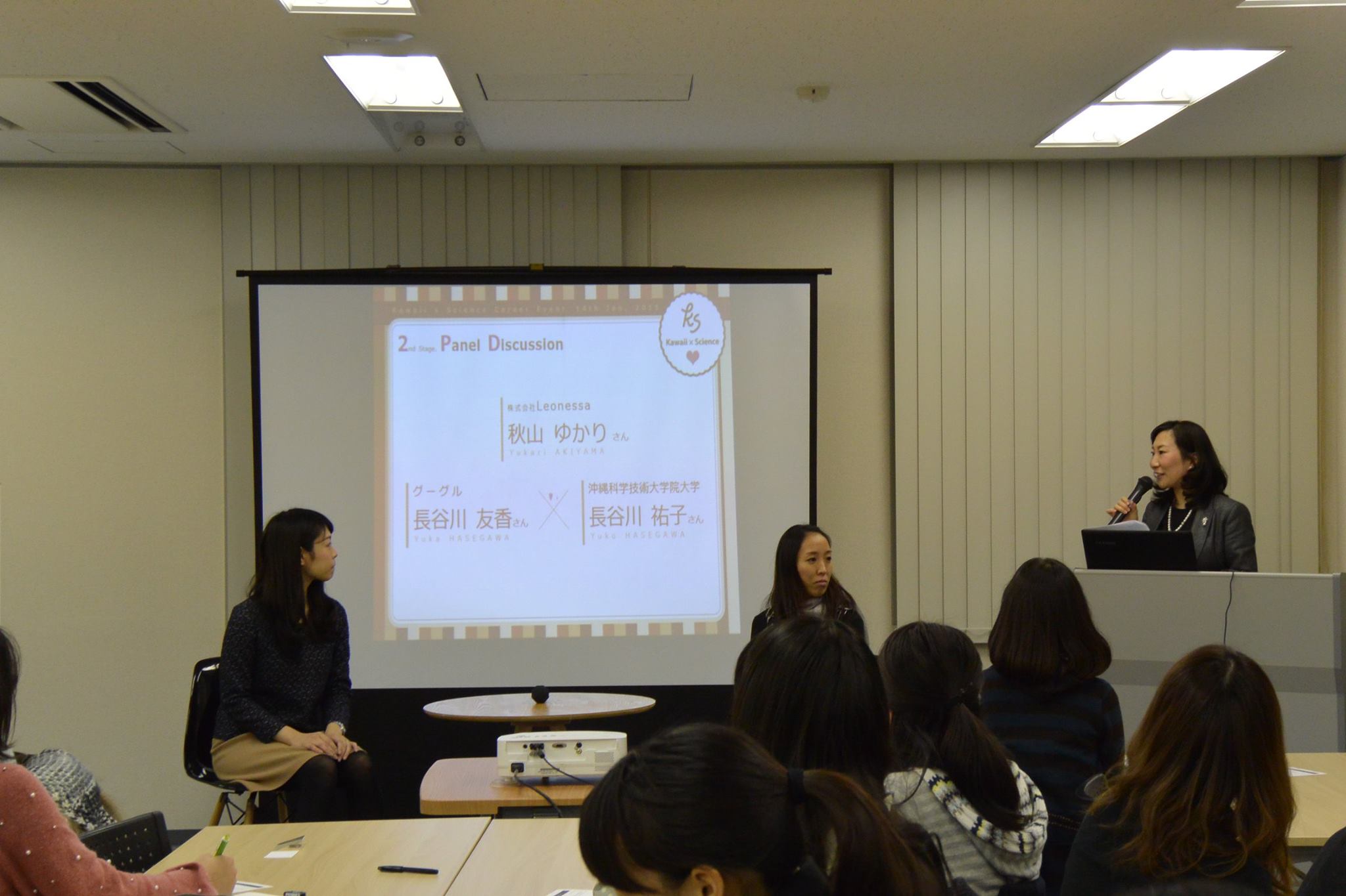 ”理工系女子による理工系女子のためのキャリア戦略講座” ということで、工学修士でエンジニア出身の私が、どういうキャリアを築いてきたかをお話させていただいた後、グーグルでテクニカルアカウントマネジャーをしている長谷川友香さん(情報系の修士)と沖縄科学技術大学院大学で海洋研究支援コーディネーターをしている長谷川祐子さん(理学博士)と3人でパネルディスカッションを行いました。