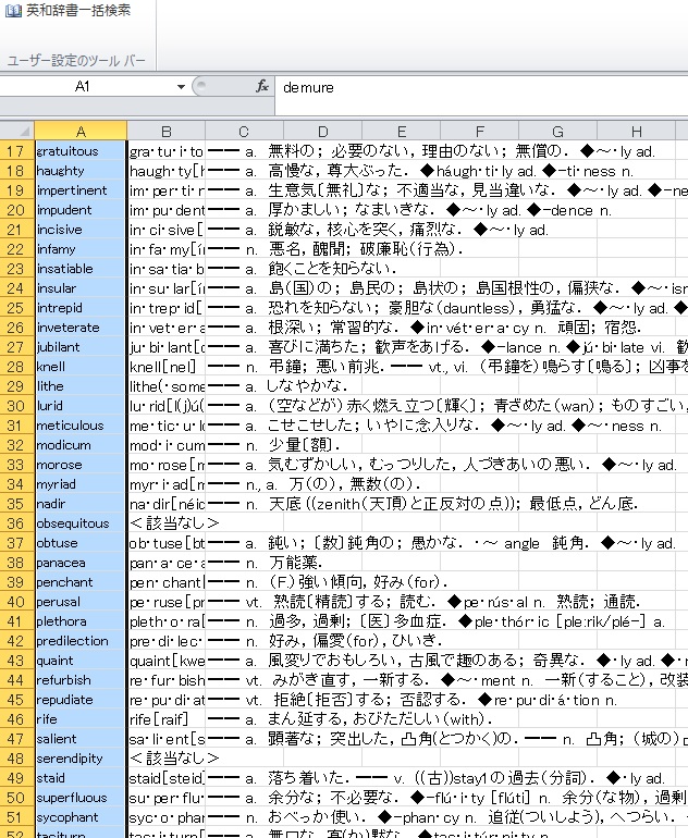すると、左の図のように、発音、品詞、意味を一括で検索してエクセルに入れてくれます。